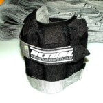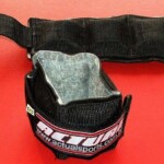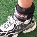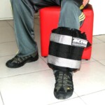 Fitas Reguladores de Ajuste ao Tornozelo do Usuário. Dependendo da carga e do modelo, a caneleira possui uma ou duas fitas reguladoras para o ajuste da no usuário, ambas com um passador.